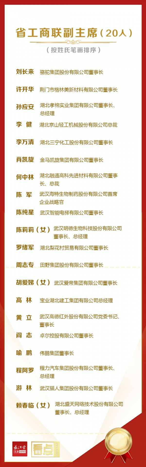 5月27日,湖北省工商业联合会(总商会)第十三届执行委员会第一次全体会议在武汉市洪山宾馆召开。会上,40名民营企业家当选第十三届湖北省工商联(总商会)兼职副主席(副会长),祝贺他们!